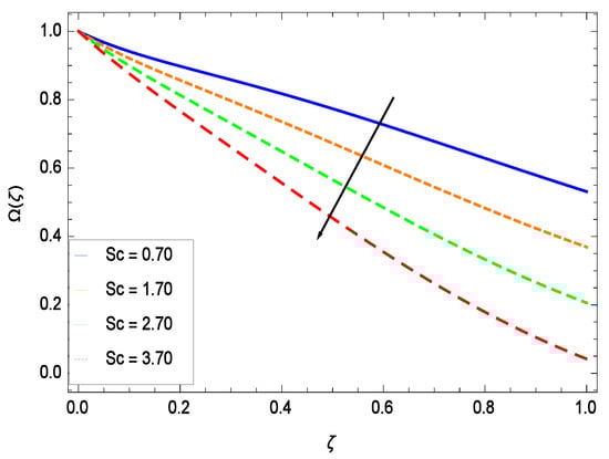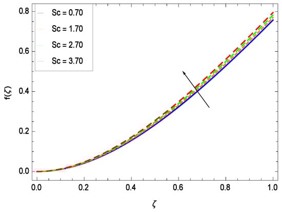 Effect on velocity profile for h = −3.00, = 0.50, = 0.60, = 0.20, = 0.30, = 1.00, Gr = 0.50, Rb = 0.70, Nb = 0.80, Nt = 0.90, Le = 0.60, Nr = 0.60, Pe = 1.00, M = 1.00, Pr = 10.00 and different values of Sc.