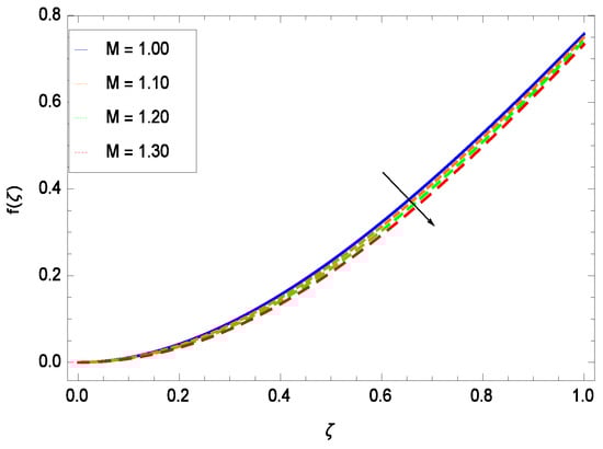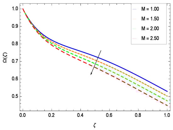 Effect on velocity profile for h = −3.00, = 0.50, = 0.60, = 0.20, = 0.30, = 1.00, Gr = 0.50, Rb = 0.70, Nb = 0.80, Nt = 0.90, Le = 0.60, Nr = 0.60, Pe = 1.00, Pr = 10.00 and different values of M.