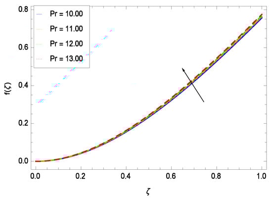 Effect on velocity profile for h = −3.00, = 0.50, = 0.60, = 0.20, = 0.30, = 1.00, Gr = 0.50, Rb = 0.70, Nb = 0.80, Nt = 0.90, Le = 0.60, Sc = 0.70, Pe = 1.00, Nr = 0.60, M = 1.00 and different values of Pr.
