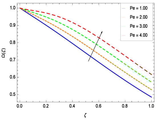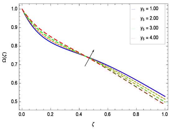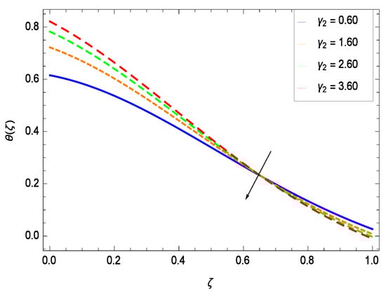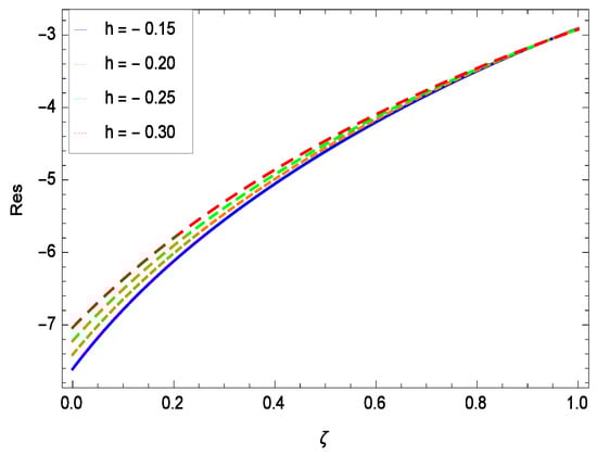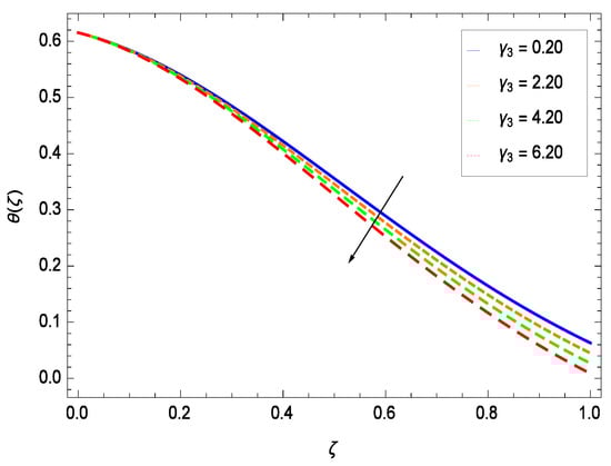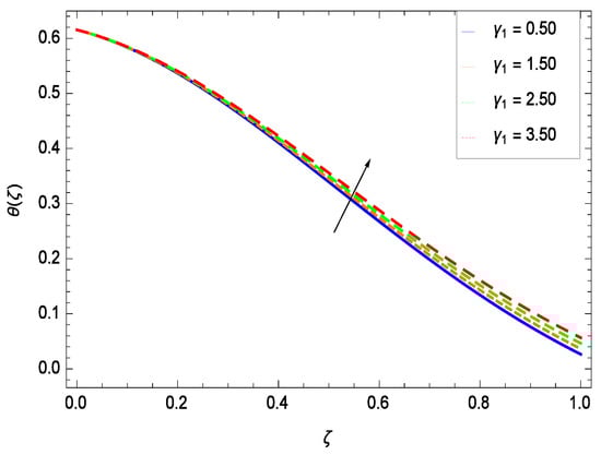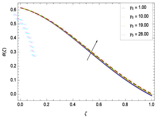 Effect on temperature profile for h = −0.80, = 0.50, = 0.60, = 0.30, = 1.00, Gr = 0.50, Nr = 0.60, Rb = 0.70, Nb = 0.80, Nt = 0.90, Le = 0.60, Sc = 0.70, Pe = 1.00, M = 1.00, Pr = 10.00 and different values of .