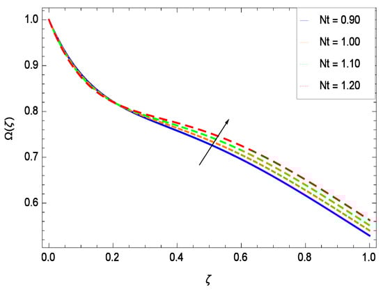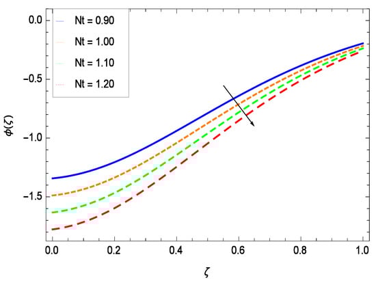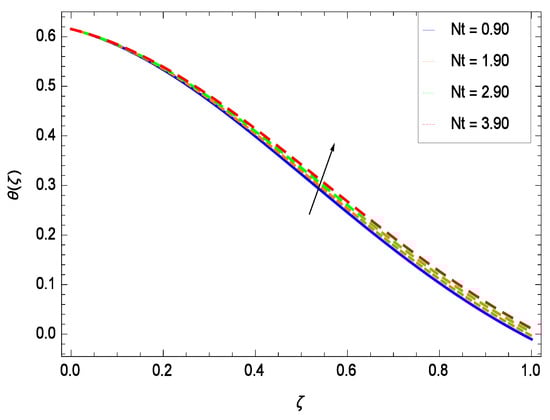 Effect on temperature profile for h = −0.90, = 0.50, = 0.60, = 0.20, = 0.30, = 1.00, Nr = 0.60, Rb = 0.70, Nb = 0.80, Gr = 0.50, Le = 0.60, Sc = 0.70, Pe = 1.00, M = 1.00, Pr = 10.00 and different values of Nt.
