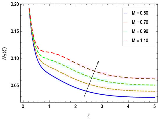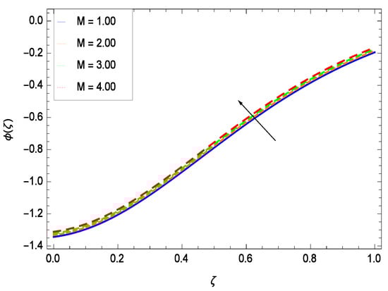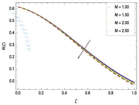 Effect on temperature profile for h = −0.50, = 0.50, = 0.60, = 0.20, = 0.30, = 1.00, Nr = 0.60, Rb = 0.70, Nb = 0.80, Nt = 0.90, Gr = 0.50, Sc = 0.70, Pe = 1.00, Pr = 10.00 and different values of M.