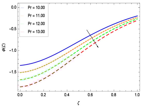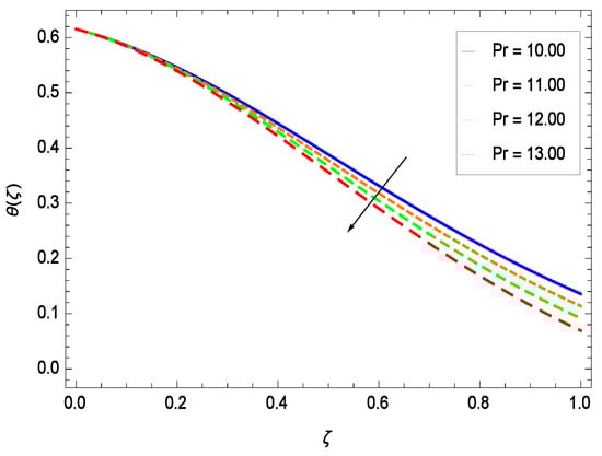 Effect on temperature profile for h = −0.50, = 0.50, = 0.60, = 0.20, = 0.30, = 1.00, Nr = 0.60, Rb = 0.70, Nb = 0.80, Nt = 0.90, Le = 0.60, Sc = 0.70, Pe = 1.00, Gr = 0.50, M = 1.00 and different values of Pr.