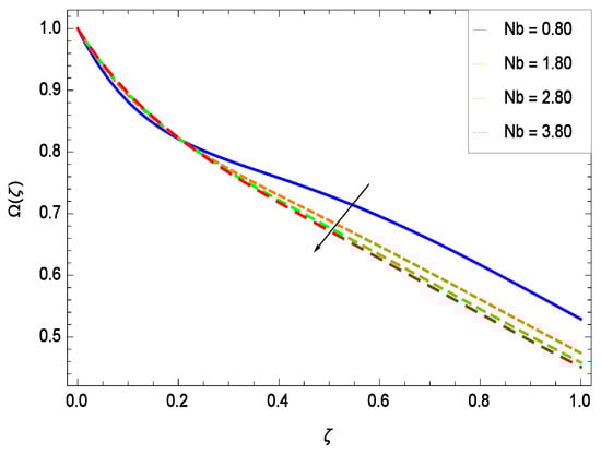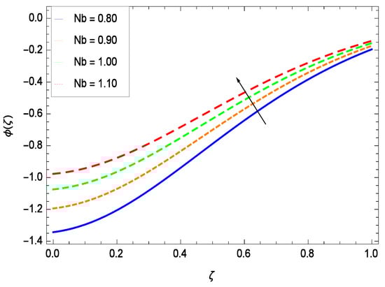 Effect on temperature profile for h = −0.80, = 0.50, = 0.20, = 0.60, = 1.00, Gr = 0.50, Nr = 0.60, Rb = 0.70, Nb = 0.80, Nt = 0.90, Le = 0.60, Sc = 0.70, Pe = 1.00, M = 1.00, Pr = 10.00 and different values of .