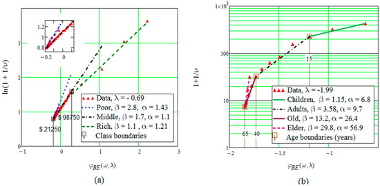 Segments in Figure 1 provide a piecewise fit of Equation (10). This is compatible with the picture of finite clusters as described for short-range interactions in Section 2.2. The point here is that each segment clearly corresponds to a social class in Figure 1a and well-known periods in human life in Figure 1b. Populations economically or physiologically wealthier, when ordered by increasing benefit, show decreasing slopes in Figure 1. This results from the definition of absolute “temperature” that follows Equation (14), for segments fitting “hotter” (richer or younger) fractions of society. Their slopes thus describe intraclass behaviour. Possible interclass interactions are discussed in the next Section. Greater equality implies a decrease in the number of states per individual in a group, .
