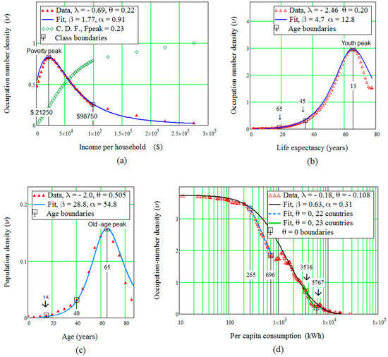 Data and fits for: (a) Income distribution. (b) Life expectancy. (c) Cancer incidence. (d) Electricity consumption.