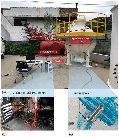- Sohaib, M.; Islam, M.; Kim, J.; Jeon, D.-C.; Kim, J.-M. Leakage Detection of a Spherical Water Storage Tank in a Chemical Industry Using Acoustic Emissions. Appl. Sci. 2019, 9, 196. [Google Scholar] [CrossRef]
