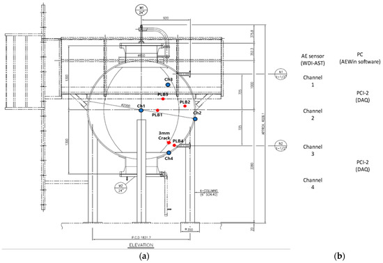 To validate the performance of the developed diagnosis model for the storage tank, we sampled the acquired AE signals at 1 MHz to capture very detailed information related to the storage tank condition. This is done with a peripheral component interconnect bus (PCI-2)-based system, as shown in Figure 1b. The connection diagram between sensors and the digitized system is described in Figure 2b, and the technical specifications of AE sensors and the PCI-2-based system are given in Table 1.