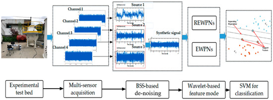 It is almost impossible to determine the number of individual sources that are mixed in a measured signal before signal analysis. Therefore, the specific signal separation model utilized in a particular case depends on the correlation between the number of observed signals (sensors) and the actual source (fault and noise) signals. These models can be categorized as determined BSS, over-determined BSS (OBSS), and under-determined BSS (UBSS). This categorization depends on whether the number of observations is equal to, greater than, or less than the number of signal sources, respectively. In practice, fault analysis-related problems usually fall into the case of under-determined BSS because the number of employed sensors is limited, and the noise sources are complex. Among popular approaches, sparse component analysis (SCA), which relies on the sparsity of sources in the time domain or other transformed domains, has been widely utilized to resolve under-determined BSS [43,44]. Several methods rely on the sparsity in the time–frequency domain to separate independent sources [45,46,47]. For instance, in Reference [45], value decomposition was performed on wavelet coefficients to determine frequencies and damping ratios, which makes this method faster than other edge detection approaches. In Reference [46], the principal component analysis was carried out on wavelet coefficients to create the partial mixing matrix of UBSS. In this study, we used the algorithm proposed by Qin [48], which uses a hybrid method combining References [49] and [50], to enhance the efficiency by estimating the mixing matrix and separating individual sources.