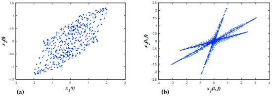 The most notable features of SCA are the cluster lines in the scattered space, which can be utilized to estimate the mixing matrix. Therefore, it is vital to examine these cluster-based features. Given a numerical example, three harmonic sources , , and are linearly unified into two observations: and . Figure 4a shows the three time–domain observations in a scatter plot. It could be seen that no useful information about the three sources was obtained from this scatter. All the points in the plot were randomly scattered and did not form any distinct cluster that could be used to identify a specific source. Alternatively, when we converted the original signal into the time-frequency domain and plot the real values of the two observations, three distinct clusters were formed. These clusters can be seen as three lines in the scatter pot, where their directions correspond to the column vectors of the mixing matrix, as shown in Figure 4b. By estimating these directions, the mixing matrix can be determined effectively. The regular short-time Fourier transform (STFT) is given as: