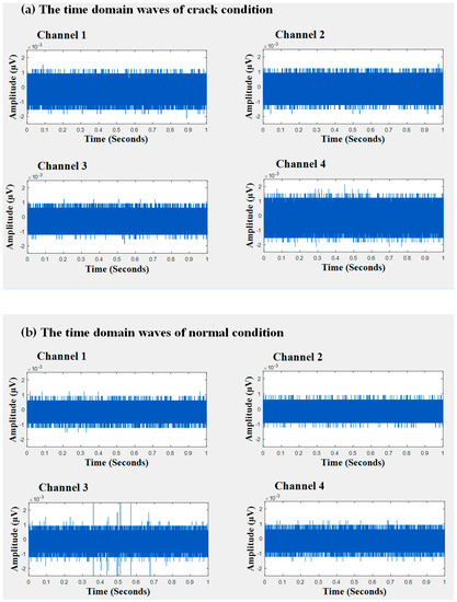 The time domain wave of observations: (a) crack condition and (b) normal condition.
