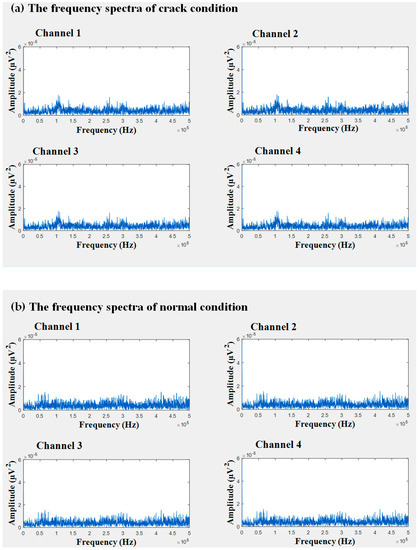 The frequency spectrum of observations: (a) crack condition and (b) normal condition.