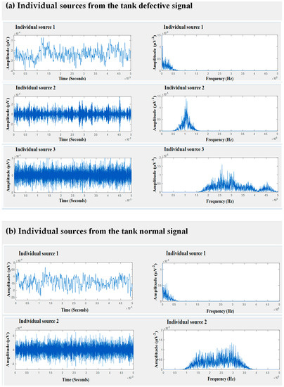 It can be seen in Figure 7 that the individual sources separated from both the faulty signal and normal signal were similar. This suggested that this source was not associated with either of the tank conditions; instead, it may have been caused by external interference. Therefore, it was safe to eliminate this signal source. In contrast, the remaining sources helped to improve the discriminative characteristics between the two tank conditions. Therefore, they were retained to reconstruct noise-free signals that could define the behavior of the different conditions of the tank. Figure 8 shows the waveforms of the recovered signals in the time domain. The recovered signals were also transformed into the frequency domain in order to better examine their characteristics, as presented in Figure 8. Later, wavelet transform features were extracted from the de-noised signals and provided to the classifier.