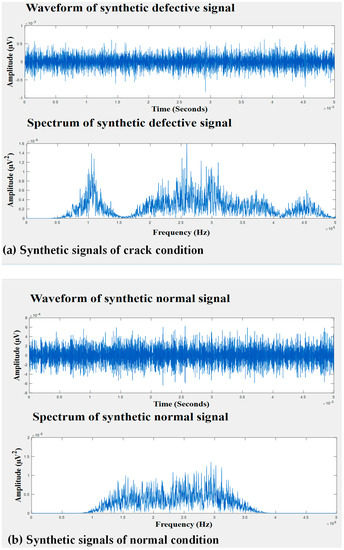 The time domain waves and spectra of synthetic signals: (a) crack condition and (b) normal condition.