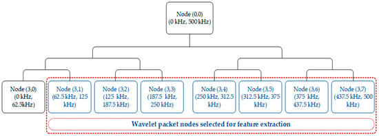 To collect AE signals for identifying non-stationary tank defects, AE sensors were attached to different locations of the tank wall. Due to the attenuation in the measured AE signals caused by the distance between crack sources and sensors, underlying information related to the storage tank failures mainly lies on the mid-frequency and high-frequency bands. The WPT, with its decomposition ability that can split a signal into low-frequency and high-frequency bands, has been widely utilized as a favorable time-frequency analysis tool for short-time transient AE signal processing. Therefore, in this study, WPT was used to analyze fault features by computing the REWPN and EWPN [51]. These fault features provided promising details regarding fault symptoms in fault diagnosis applications. To calculate these features, we decomposed a one-dimensional AE signal into eight wavelet packet nodes via three-level WPT with the help of Daubechies 20 (or db20). From Figure 8, it is noticeable that the inherited information regarding faults in the AE signals of the tank was mostly located in the mid-frequency and high-frequency bands. Thus, we used wavelet-based fault features (REWPN and EWPN) that were extracted from the last seven mid-frequency and high-frequency wavelet packet nodes, as shown in Figure 9. The REWPN of the nodes was calculated as follows: