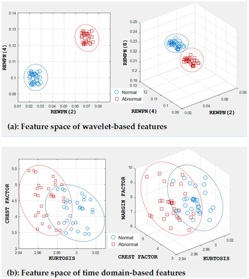 Feature space of (a) wavelet-based features and (b) time domain-based features.
