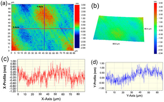 Figure 1. Surface profiles of the Al0.3CoCrFeNi high-entropy alloy thin films (HEATFs) characterized by white light interferometry (WLI) technique. (a) 2D surface profiles, (b) 3D surface profiles, (c,d): the profiles of the x-axis and y-axis as marked in (a) respectively.