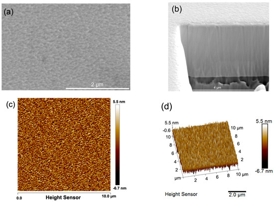 Figure 2. Surface morphologies and microstructures of the Al0.3CoCrFeNi HEATFs characterized in detail by scanning electron microscopy (SEM) and atomic force microscopy (AFM). (a) The SEM image of the surface morphologies, (b) the cross-section the HEATFs deposited on the silicon substrate, (c) the AFM image of the surface structure, and (d) 3D surface structures of the HEATFs.