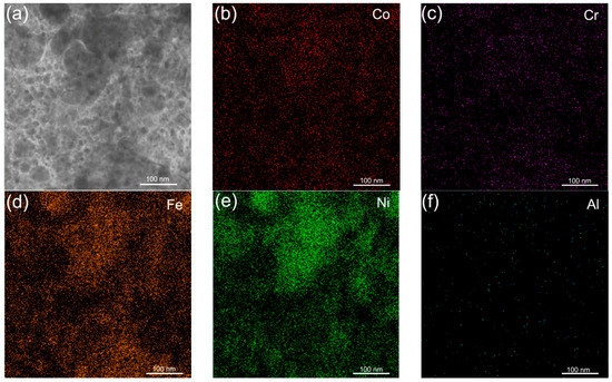 Figure 3. Element distribution mapping for the Al0.3CoCrFeNi HEATFs by TEM-EDS. The top TEM image shows the region analyzed. (a) Explanations for subfigure a; (b) explanations for subfigure b; (c) explanations for subfigure c; (d) explanations for subfigure d; (e) explanations for subfigure e; (f) explanations for subfigure f.