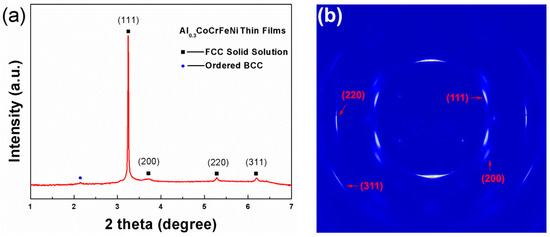 To obtain the phase structural information of the Al0.3CoCrFeNi HEATFs, high-energy synchrotron radiation X-ray studies were undertaken. Figure 4a shows the X-ray line profiles of the HEATFs. The (111), (200), (220), and (311) phase peaks were observed and identified to be a typical FCC crystalline structure, whilst a small peak appeared before the (111) peak, which means that a minor ordered BCC NiAl type phase structure was in the HEATFs [37]. The corresponding diffraction patterns are exhibited in Figure 4b. The weak continuous rings certify that there are tiny polycrystalline structures in the HEATFs. Interestingly, the diffraction rings of the HEATFs were discrete, with obvious intensity differences, indicating that there were strong textures in the HEATFs. This event could be ascribed to the preferred growth of the thin film induced by the silicon substrate. It should be noted that a rigorous diffraction-intensity-distribution calculation of the solid solution phases responsible for certain orientations in the HEATFs is worthy of a focused topic. However, it is beyond the scope of this work. The synchrotron X-ray experimental results provide cogent evidence that the magnetron sputtering technique is an effect way to prepare the HEATFs with a simple phase structure. Moreover, it could also lead to a wide research range of HEAs, studying the corresponding properties from meso- to nanometer regimes.