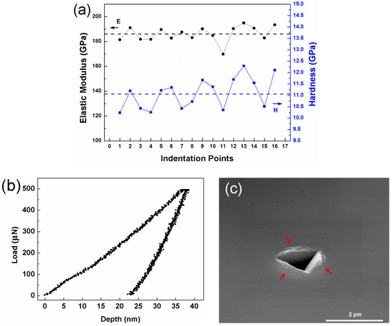 Figure 5. Nanoindentation properties of the as-deposited Al0.3CoCrFeNi HEATFs. (a) Elastic modulus and hardness of the HEATFs at different indentation points, (b) typical nano-indentation load–depth curve, and (c) typical SEM image of the impression mark.