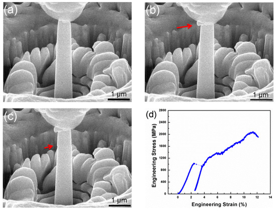 To further characterize the mechanical properties of the Al0.3CoCrFeNi HEATFs, a nanopillar sample with a diameter of 738 nm was fabricated from the HEATFs, and in situ SEM compression tests were conducted on the nanopillar sample, as shown in Figure 6. The entire compression deformation process of the nanopillar can be divided into the following stages. Initially, the nanopillar was deformed elastically, and no significant trace appeared on the surface of the nanopillar, as shown in Figure 6a. Secondly, with the increase of the compressive stress, a large localized metal flow and plastic deformation occurred at the top part of the nanopillar, as marked with a red arrow in Figure 6b. It indicates that the deformation of the Al0.3CoCrFeNi HEA nanopillar was inhomogeneous. After that, it can be observed that a slip was generated at the top part of the nanopillar, which was marked with a red arrow in Figure 6c. The occurrence of the slip is not only related to the plastic deformation, but also has an impact on the work hardening and the serration behavior of the HEAs [40]. The corresponding compression engineering stress–strain curve of the Al0.3CoCrFeNi HEA nanopillar is shown in Figure 6d. The yield strength of the nanopillar is about 1024 MPa, which is also about three times that of the bulk sample [38]. It is consistent with the above experimental results obtained by nanoindentation, as the strength is directly proportion with the hardness. After yielding the nanopillar exhibits work-hardening up to an ultrahigh strength. The compressive strength and corresponding strain were ~2075 MPa and ~11.39%, respectively. Following this, softening dominates until final fracture at a strain of ~12.14%. In general, the compression results further confirmed that the yield strength of the Al0.3CoCrFeNi HEATFs is about three times that of the bulk samples, and the plastic deformation is inhomogeneous.