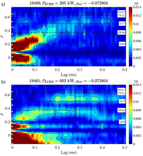 The TE is calculated between two signals, in this case between data measured by an ECE channel at a reference position (Y in Equation (1)) and data from an ECE channel at another position, r (X in Equation (1)).