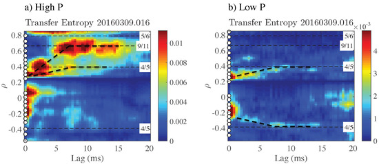 Transfer entropy calculated from ECE data taken at the W7-X stellarator, at (a) MW and (b) MW. The color scale indicates the value of . Radial propagation is indicated with thick dashed lines. Figure reproduced from [11].
