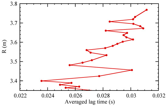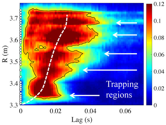 In this section, we will analyze high-resolution ECE data from the JET tokamak (major radius m) [15]. JET discharges are usually characterized by sawtooth activity in the core region (reconnection events associated with the rational surface). These events produce a rapid expulsion of heat from the core, and the resulting heat pulses can be analyzed to obtain information about heat transport [16,17,18]. In Figure 3, a typical TE graph is shown for m, versus time lag and the R value of the other ECE channels. The R range is chosen outside the surface, in order to allow tracking the propagation of the heat pulses caused by the sawtooth crashes. Different from the results shown in Figure 1 and Figure 2, here, the radius indicated on the ordinate of the graph is the major radius, rather than the normalized minor radius. The reader should be aware that the magnetic axis or plasma center is typically located near the major radius of the torus, m, while the plasma edge is located near m. This example graph shows that overall transport is outward, as indicated by the white dashed line. The velocity of this propagation, given by the slope of this line, is consistent with the typical heat transport coefficients measured in the JET tokamak using other techniques [19].