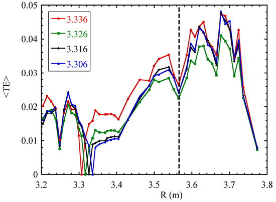 In order to quantify the location of the observed radial minima of the TE, we calculate the average of the TE over the available time lags (or up to a specific maximum time lag), . Figure 4 shows an example of this curve for various choices of reference radius. It is observed that the locations of some minima of do not depend on the choice of reference radius, within a reasonable range, but rather are associated with the magnetic configuration (cf. the minimum indicated by the vertical dashed line in Figure 4). The minimum occurring at the reference radius itself has a trivial origin and should be ignored. The location of minima in the graphs of can be subjected to a statistical analysis, based on the set of all available values for a given discharge. To do so, we count how often each local minimum occurs with respect to the total number of reference radii studied and express it as a percentage. This number is defined as the “persistence” of any given local minimum.