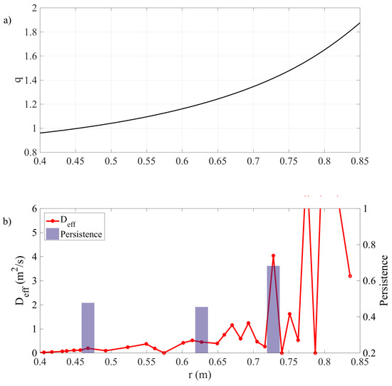 (a) Profile of the safety factor, q, averaged over the time window of interest (9–12 s) and (b) corrected effective diffusion and persistence.