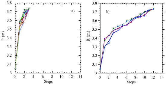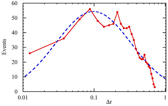 Figure 7 shows the distribution of radial steps. Previous studies involving the analysis of tracer trajectories in simulations of the topological structures in plasma turbulence suggest that the lognormal distribution may play a significant role [23,24], and indeed, the present result seems to be compatible with this idea, as shown by the fitted line.