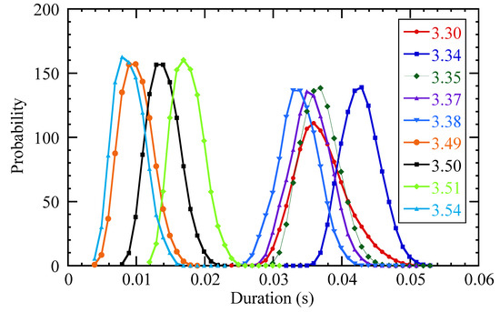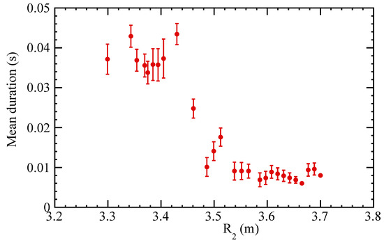 Figure 8 shows the statistical distribution of the times needed to reach the outer edge of the system from an initial position in the core, calculated from a transfer entropy dataset obtained from ECE data (one element of the set, at a single reference radius, being Figure 3), using the recursive method described above. Remarkably, the distributions seem to separate into two distinct classes, namely fast and slow paths, according to the first step taken ().