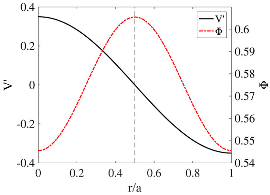 Potential fluctuation () and shear of the generated flow () for a simple nonlinear slab model. The vertical dashed line shows the position of the singular surface. Figure reproduced from [15].