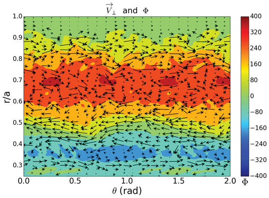 Figure 12 shows a snapshot of a typical modeling result obtained with the mentioned resistive MHD model in stellarator-like (low shear) cylindrical geometry. The area of the graph corresponds to a region of the poloidal-radial () plane at constant toroidal angle ( constant). The graph shows vortices (trapping regions), such as the poloidally periodic structures seen near , related to a corresponding rational surface. Also visible are zonal flow regions (horizontally elongated structures with predominantly horizontal flow velocities in both directions), on both sides of the vortex sequence.