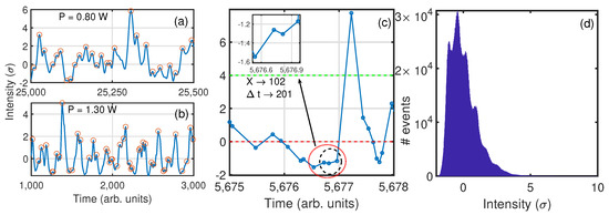 Figure 1d shows the histogram of the events for 1.00 W. This histogram shows a long tail for high intensities. This type of long-tail distribution is present in a wide variety of systems [15,16,17,18], which can lead to unwanted phenomena; hence the importance of understanding and being able to forecast when the system is going to perform events corresponding to the tail, sometimes referred to as extreme events.
