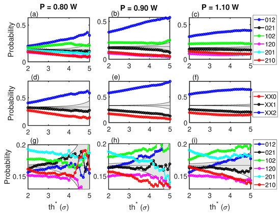 Figure 2 shows the six OPs of dimension three versus the threshold, , for three power outputs, 0.80 W (in the laminar regime), 0.90 W (at the transition), and 1.10 W (in the turbulent regime). The top row corresponds to the OPs generated with the intensity of the events. It can be observed that there are OPs that are more likely to happen and OPs that are less likely to happen, before the change from low-intensity to high-intensity events. This points to some structure in the complex dynamics that manifests as a preference of patterns before performing a high-intensity event. The gray region corresponds to the probabilities of a stochastic process of the six OPs equally probable. This region depends on the number of events in each threshold. For a high enough threshold, the number of high-intensity events preceded by low-intensity events is too low to have conclusive statistics, and therefore, the gray region widens, while the OPs probabilities lie in the gray region.