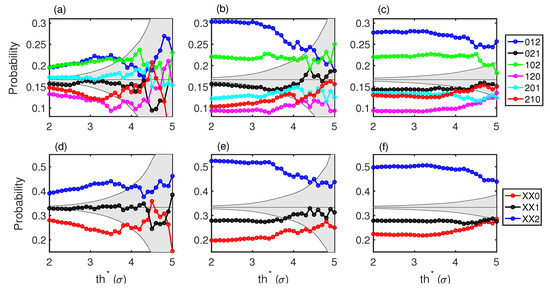 After this, Figure 2d–f indicates that between 40% and 50% of the high-intensity events will be preceded by pattern , i.e., of the three preceding events, the latest one is higher than the other two. In other words, this indicates that the change from low-intensity to high-intensity is not as sharp as it could be, as the peak preceding the high-intensity peak tends to be the highest of the three. This figure also shows that the OP probabilities do not depend on the threshold.