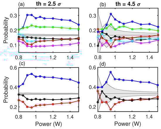 With this more restrictive condition of two thresholds, the number of events that satisfy that , , , and is reduced. This is reflected in the wider gray regions in Figure 3 and in the fact that above , the probabilities are compatible with a stochastic process, so we cannot use this as a forecasting method in that region. However, this is a characteristic of the dynamics of the system, as the high-intensity events are not rare and the system does not show too many consecutive low-intensity peaks before preforming a high-intensity peak. In any case, for power outputs of the laser above the transition ( 0.90 W) and events larger than , we can still see that 50% of these intense events happen after the XX2 pattern.