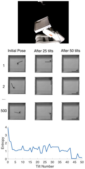 Experimental setup (top). An industrial robot tilts an allen key, with April Tag attached, in an aluminum tray. The overhead camera records the pose of the allen key after each tilt. Each trial (1), (2), ⋯, (500) performs the same random sequence of actions with a different initial position. The pose before the sequence, mid-sequence after 25 tilts, and after the sequence of 50 tilts are shown per trial, as well as the entropy of object pose distribution over 500 total repeated trials (bottom).