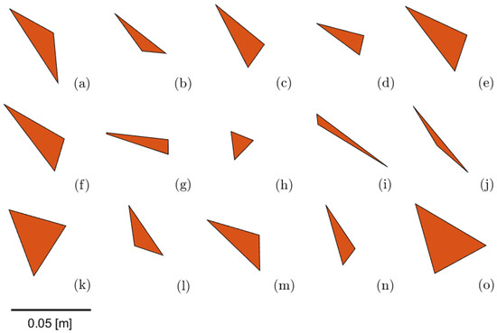 During the second set of experiments, we tested the effect of varying object shape. We used 15 different triangular object shapes (see Figure 2) and applied the fastest converging sequence we found for the allen key (shown as the green line in Figure 3). We conducted repetitions for each object, starting at a randomly sampled initial object configuration.