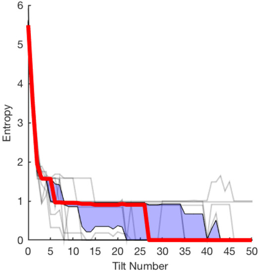 The results are shown in Figure 6. For the low noise maps, 10 of the 13 entropy trends converged to zero entropy. On average, entropy converges to a value close to zero by the 9th tilt.