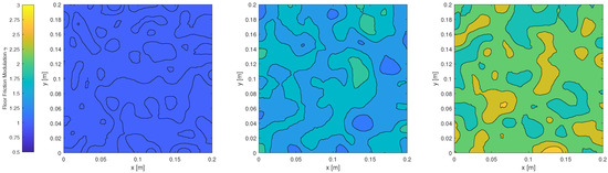 Spatially varying floor friction with low (left), medium (middle), and high (right) variation.