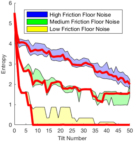Figure 6 also shows the results for medium and high noise. None of the medium- or high-noise maps converged to zero entropy. In both cases, the Kruskal effect is observable in that the general trend of entropy is decreasing, although they tend to not converge to zero entropy within 50 actions. These results show that lower friction noise positively affects the probability distribution of object poses towards convergence. It is also likely that better-performing sequences exist for higher friction noise levels. Longer sequences are necessary to draw conclusions as to whether entropy for medium and high friction noise will level off or converge after more than 50 tilts.