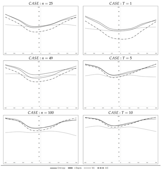The prevalence of both criteria is quite regular for the four cases shown in the tables. The preference extends to the case of correctly specified models, as in Table 2, Table 3 and Table 4, and also for misspecified equations, as in Table 5, for negative and especially for positive values of the spatial coefficient, for small and large number of individuals in the sample (n) and for simple to large panels (T). Overall, entropy attains the highest rate in of the 144 cases in Table 2, Table 3, Table 4 and Table 5, followed by , , Bayes, , and , .