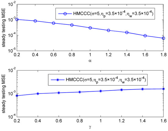 Then, we compared the steady testing MSE of HMCCC under different noise parameters. We ran 15,000 iterations to make sure the HMCCC reaches steady, and calculated the steady testing MSE with the average of next 1000 iterations. Figure 3 shows the steady normalized testing MSEs under different characteristic factors and dispersion parameters, respectively. It illustrates that HMCCC can perform well under different parameters of alpha stable noise.