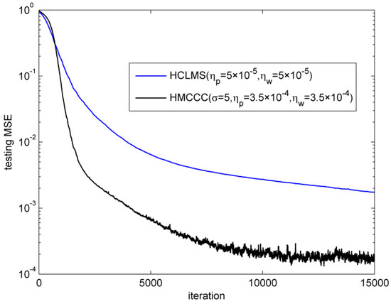 In this part, we provide some simulations to illustrate the superior performance of HMCCC. We chose the weight vector as and the complex polynomial coefficient vector as . An additive complex noise was considered in the simulations, with and being the real and imaginary parts, respectively. We compared the performance of HMCCC with HCLMS (HCLMS is the extension of HLMS [17] to complex domain, which is summarized in the Appendix A), and chose the parameters of both algorithms by trial, in order to ensure a desirable solution. Simulation results were obtained by averaging 100 Monte Carlo trials. The input signal was generated by a first-order autoregressive process, as follows: