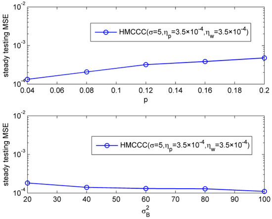 Furthermore, we tested the robustness of the HMCCC algorithm to the outlier. The CG noise was also used in this simulation, where , , , and . Figure 6 depicts the steady normalized testing MSE of the HMCCC algorithm in the case of different probabilities of outlier, (), and variances of outlier, , where 15,000 iterations were run to make sure HMCCC reached steady, and the steady normalized testing MSEs were calculated with the average of the next 1000 iterations. One can observe that the proposed HMCCC algorithm is robust to the outlier, and behaves well under different and . Moreover, HMCCC has a slightly smaller steady testing MSE with a bigger , which is a little surprising, but is consistent with Chen’s work [9]. This is due to the fact that the convergence rates are slightly different under different , even with the same learning rate.
