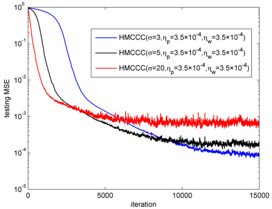 Afterward, we investigated the influences of the kernel width on the performance of HMCCC. The CG noise was also employed in this simulation, where , , , and . Figure 7 presents the normalized testing MSE of HMCCC in the case of three different kernel widths . It can be seen that kernel width has a vital role on the learning rate and steady value of HMCCC. With a small kernel width, HMCCC converges slowly, but achieves a small steady value. On the contrary, with a large kernel width, HMCCC converges quickly, but achieves a high steady value.