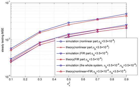 Finally, we compared the simulated steady testing MSEs with the theoretical ones. The Gaussian noise is used in this simulation, where and . It is noted that the testing MSEs were not normalized in this simulation, and were obtained from a test set of 1000 samples. In addition, the theoretical values for the nonlinear part and FIR part were calculated by Equations (26) and (27), respectively. Figure 8 shows the simulated steady testing MSEs and the theoretical ones under different , where 40,000 iterations were run to make sure the algorithm reached steady, and the steady testing MSEs were calculated with the average of the next 1000 iterations. One can see that the simulated values almost matched with the theoretical ones for the nonlinear part and FIR part. Moreover, there is a little gap between the simulated whole system and the sum of theoretical nonlinear and FIR parts, which is the value of cross EMSE.